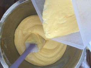 将煮好的牛奶加入打发蛋黄中、搅拌均匀后加入香草精及玉米淀粉拌匀