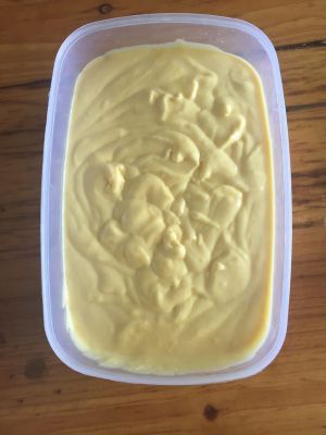 倒入密封盒内加盖、入冰箱冷冻2-3小时 当冰淇淋已半凝固时、取出用铲由底部向上翻起、把冰淇淋翻拌均匀、每2-3小时操作一次 反复3次就可以