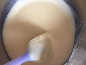 一边搅拌一边隔水加热至液体变浓稠、玉米淀粉开始糊化