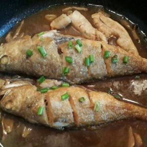 煎鱼的余油放入葱姜蒜,香气出来后倒入调好的酱汁,放入黄瓜鱼,焖烧2-3分钟,最后加陈醋,勾兑芡粉,撒入葱花,装盘。