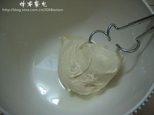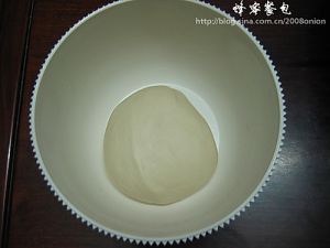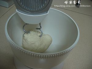 将除了玉米油外的所有材料,先用手工和成团,然后放入打蛋器的圆盘内开启机器,手要按在打蛋器把手上以防搅拌过程中打蛋器出现松脱: 2分钟1档 + 休息2分钟+2分钟1档 +休息2分钟,直至面团可拉出稍厚的薄膜。这个时间度要看搅拌的面粉量而定,但是这个功率300W的打蛋器每次搅拌最好都不要超过250G面粉量,而且刚开始搅拌也是要每2分钟1档搅拌一次,然后休息2~3分钟。夏天的时候要把面团连同搅拌棒一起放到冰箱里冷藏,以防面团的温度过热