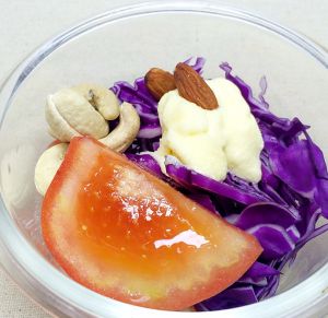 紫甘蓝切细丝,西红柿切片,加盐拌匀,淋上沙拉酱即可