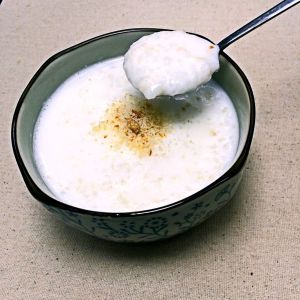 粳米煮熟加入麦片牛奶开锅即可