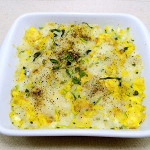土豆蒸熟压碎,鸡蛋过油5分熟,加入土豆泥翻炒片刻出锅入烤盘,淋上食用油以及椒盐。入烤箱中层180度10分钟。