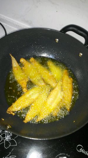 油开后,下入鱼,炸至金黄色。
