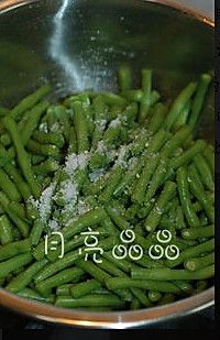 降温后的豇豆捞出沥干水分,切段,放大盆中,放盐和鸡精码味。