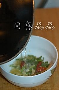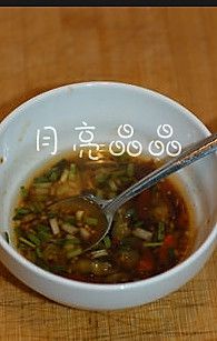浇了热油的调料碗中加一汤匙盐、一汤匙香醋、两汤匙生抽、一汤匙麻油、一点鸡精拌匀。