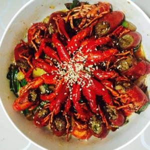 油炸小龙虾,至小龙虾变红,捞起来入盘,在炸土豆片和洋葱圈,炸好了,捞起来入盘。