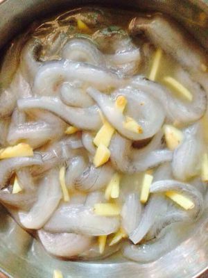 将水潺洗净后放在盘中,加入老酒、盐、白糖、味精和姜丝拌匀待用,静置半小时入味