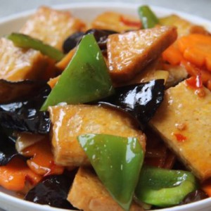 1.放入煎好的豆腐,与蔬菜一起翻炒;