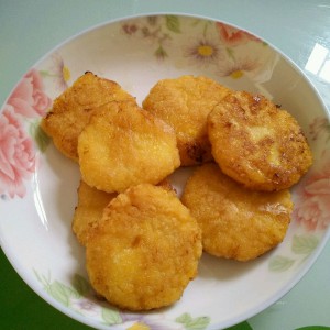 放油,烧热之后放南瓜饼,中火煎两面变黄即可出锅。