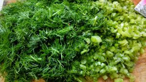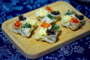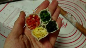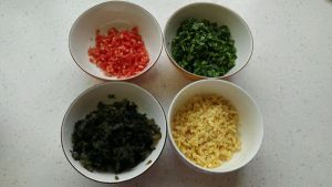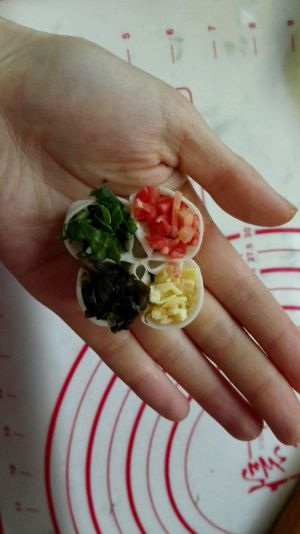 地软提前泡发撕碎,蛋饼切碎,胡萝卜切小丁,青菜也切碎。切的越小越容易往蒸饺里面填。