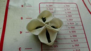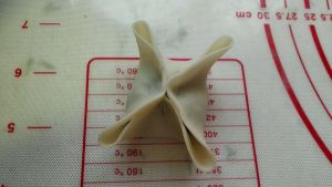 相邻的两边捏合,同样是点一点水以便黏合。撑开四个口袋。