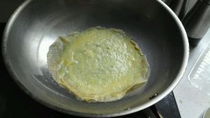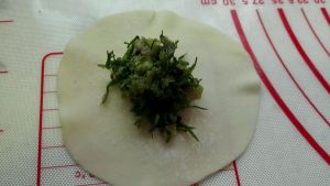 取一张饺子皮,在中间放上少许茴香肉馅。我的饺子皮是买的,比较厚,于是自己又擀了擀,大家也可以自己和面做皮儿。