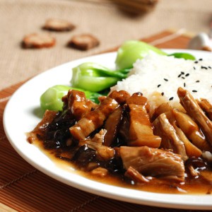 将煮好的腐竹烧肉和青菜倒在米饭上即可食用。