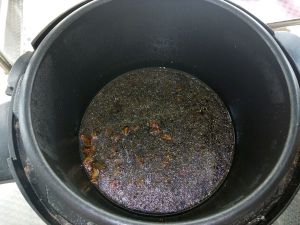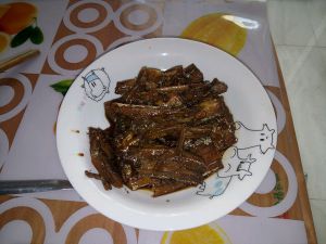 然后把腌制好的带鱼放在高压锅里,然后放点糖,生抽,老抽,一点醋,老抽不要放多了。