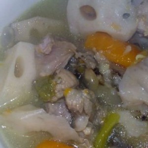 乘足量冷水,将排骨,胡萝卜,莲藕,眉豆,葱,姜置入,留小部分葱备用。 武火至沸10分钟,改文火45分钟