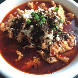 把煮熟的肉倒入铺满上海青和鸭血的盆中,在上面放上之前准备好的蒜粒和花椒辣椒末