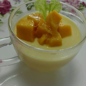 等牛奶液凉了加入淡奶油搅拌均匀,倒入容器中,放冰箱冷藏四小时以上,放少许芒果果然就可以享用啦!