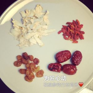 准备的食材都在照片上啦~洗干净就行了~然后我用的是两人份的炖盅,由于都是下班回来才能做饭~时间比较赶,用滚水比较快~鸡肉先放一点点盐抓好会比较入味~其他材料全部一起放进去就行了~