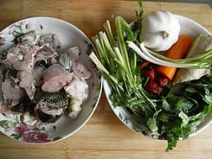 牛蛙洗净斩块。所有素菜洗净,大蒜剥好。