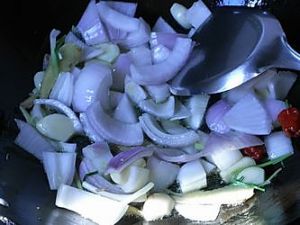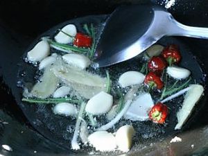 热锅热油大蒜、姜片、辣椒、葱段煸香。