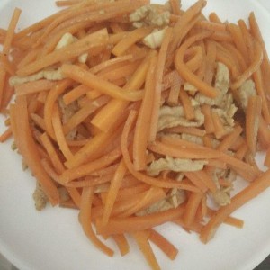 准备好食材,蒜瓣,瘦肉,胡萝卜,刀工有限,嘻嘻,切的太粗了