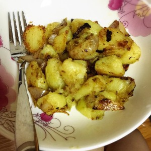 热锅橄榄油,下洋葱炒至半透明,入土豆块儿翻炒,不停地翻炒,加一小勺盐,和一小把孜然,炒至自己喜欢的焦度和成色就可以起锅了。