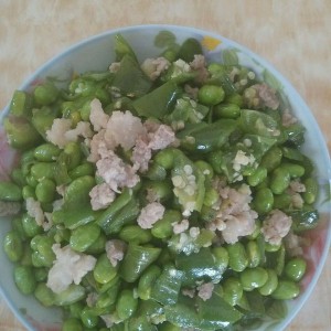 热锅放油,先放瘦肉炒两分钟不要炒太久了会很老的,毛豆青椒一起放锅