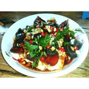 准备所有材料,嫩豆腐切片铺盘底,青椒切碎丁围盘边,皮蛋一分为四摆豆腐上