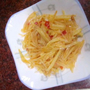 开锅,热油,将蒜放下去爆香(小心溅出),再放辣酱炒几下,再放土豆丝。翻炒几下,加入陈醋和盐,快速翻炒。