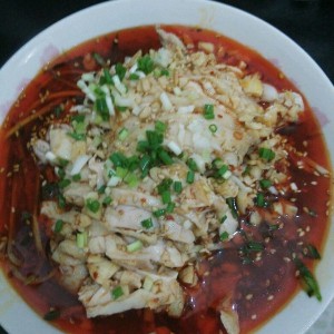 红油一碗,制作过程:油烧热倒入豆瓣酱,干辣椒,花椒,桂皮八角少许。炒出红油,用滤网沥出红油后加入蒜泥,盐,芝麻,胡椒粉,糖,醋,酱油搅拌均匀即可。