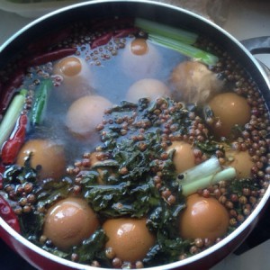 如图所示,锅里边加水直接放入葱段,辣子角,花椒,茶叶