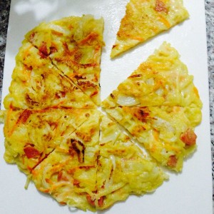 土豆,胡萝卜,打成丝儿,洋葱切片,火腿切丁,打两个鸡蛋,适量面粉,矿泉水,少许盐,打成糊状,不能太希