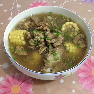 将排骨,玉米,核桃仁,姜片,料酒,盐放入砂锅加入水大火炖1小时