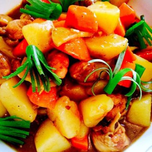 锅内到少许油放入葱姜蒜爆香,倒入鸡块翻炒一下去腥,再依次倒入土豆 胡萝卜加入适量胡椒粉翻炒