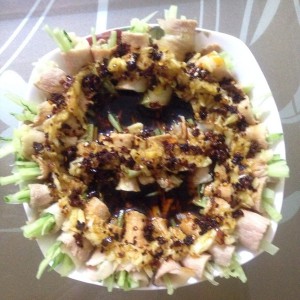 将冷后的白肉切薄片,黄瓜切丝,大蒜打成蒜泥!
