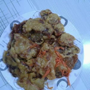肉切片、大概菜刀贝那么厚、加少许盐淹半小时、这里注意、喜欢咸口要多加盐哦!等待的同时调糊、面粉跟淀粉以1:3的比例加水调匀!