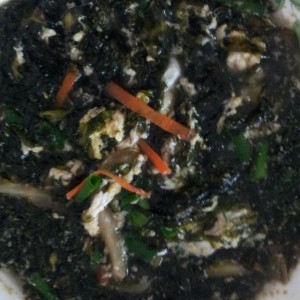锅里放入清水,滴入几滴油,等水烧开,放入紫菜、榨菜、胡萝卜。
