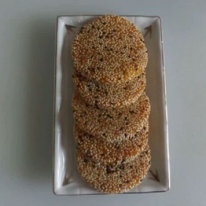 每压好一个,都要拿到手上轻轻拍一下,拍掉多余的芝麻,在煎的时候芝麻不会掉满锅。