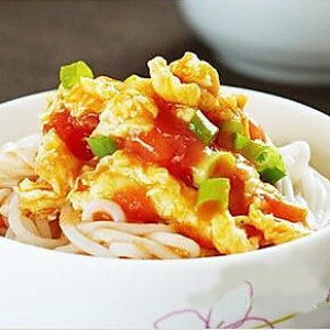 另起一锅放水煮面,面好即盛入装有西红柿汤的面碗,撒上香葱。