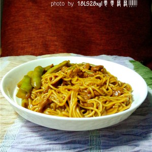 加盖,用中小火将食材焖熟,水分收干时,调入鸡精,将面条与四季豆拌匀;