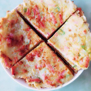 放一起后加入少量水搅匀。成糊。取平底锅,热油,取一汤勺的量,摊平,至双面金黄,可以出锅了。(最好火大一点,带一点胡,口感比较好,边比较酥。)