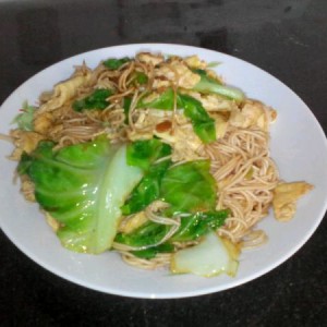炒锅放油,比平时炒菜用量多一些,放入豆瓣酱,味极鲜,酱油,加入圆白菜翻炒,圆白菜发软后加入鸡蛋,面条,迅速翻炒,待面条变酱色后出锅。