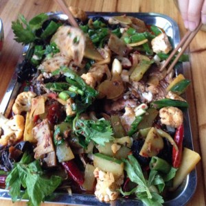 鱼烤熟放在盘子里,然后开始炒料,在锅里放入色拉油加入干辣椒段和郫县豆瓣和酱油老干妈炒一下加入适量的水,在把先把泡好的木耳和花菜先先放进锅里煮一下,因为他们不容易煮熟,煮一会在加入藕、土豆、洋葱、芹菜、新鲜小辣椒,姜,蒜、莴笋、黄瓜,煮熟直接淋在烤鱼上面就OK啦