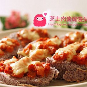 在馒头片上铺上肉酱然后将芝士片盖在上面,偶日志里有肉酱的做法