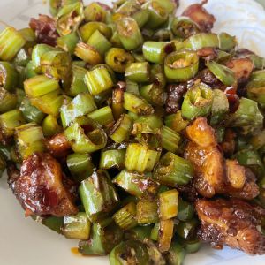 再倒入辣椒和芹菜段。少许生抽,少许蚝油,出锅前撒点鸡精