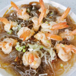 整理成型的大虾摆盘 ,淋上蒸鱼豉油,上锅蒸十分钟