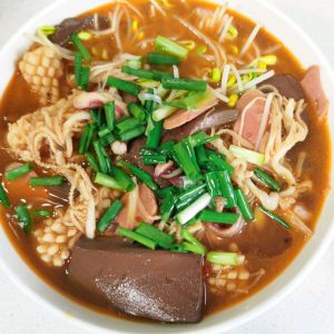 汤烧开后依次下鱿鱼须,鱿鱼卷,鸭血,牛百叶,烧开。装入焯好的豆芽里。