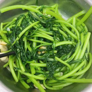热锅凉油放入切好的老蒜炸香,倒入洗净切好的茼蒿